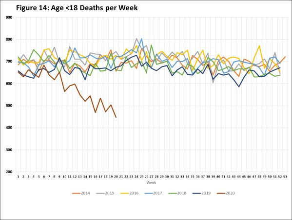 One very clear change that has received publicity is that public health officials are bemoaning the sharp decline in infant vaccinations as parents are not taking their infants into pediatric offices for their regular well-baby checks. In the May 15 [2020] issue of the CDC Morbidity and Mortality Weekly Report (MMWR), a group of authors from the CDC and Kaiser Permanente reported a sharp decline in provider orders for vaccines as well as a decline in pediatric vaccine doses administered. Santoli, Jeanne M et al. Effects of the COVID-19 Pandemic on Routine Pediatric Vaccine Ordering and Administration — United States, 2020. cdc.gov. [Online] May 15, 2020. These declines began in early March, around the time infant deaths began declining.