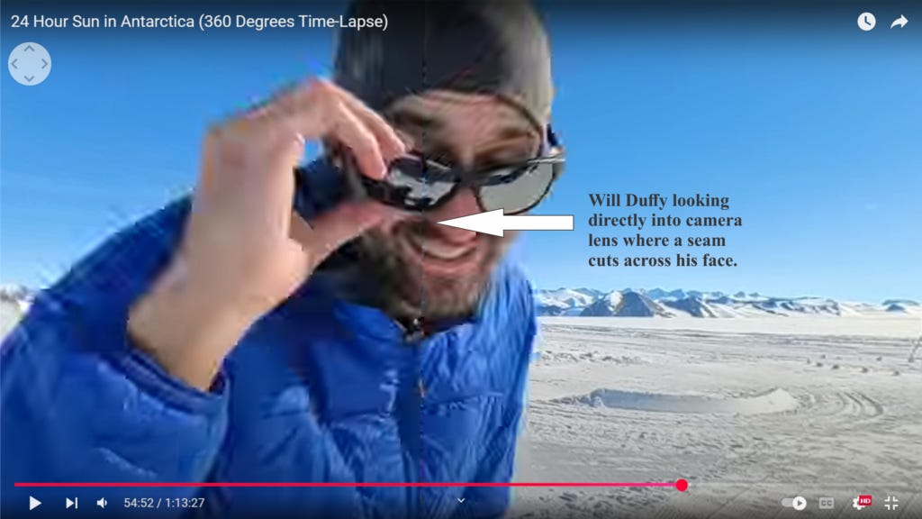 In addition, the Insta 360 camera stitch seams should only appear at the joinder of the two videos at the periphery of the lenses. The Insta 360 camera in Antarctica was pointed south toward the mountains. That was the key thing that The Final Experiment clowns wanted in the video. They had one of the two camera lenses pointed south at the mountains. Insta 360 cameras do not put seams in the center of the lens’s field of view.